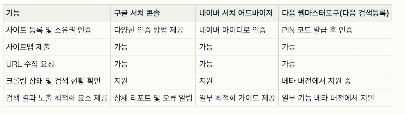 - 다음(Daum)은 구글 서치 콘솔, 네이버 서치 어드바이저와 비슷한 역할을 하는 ‘다음 웹마스터도구’라는 서비스를 제공한다
